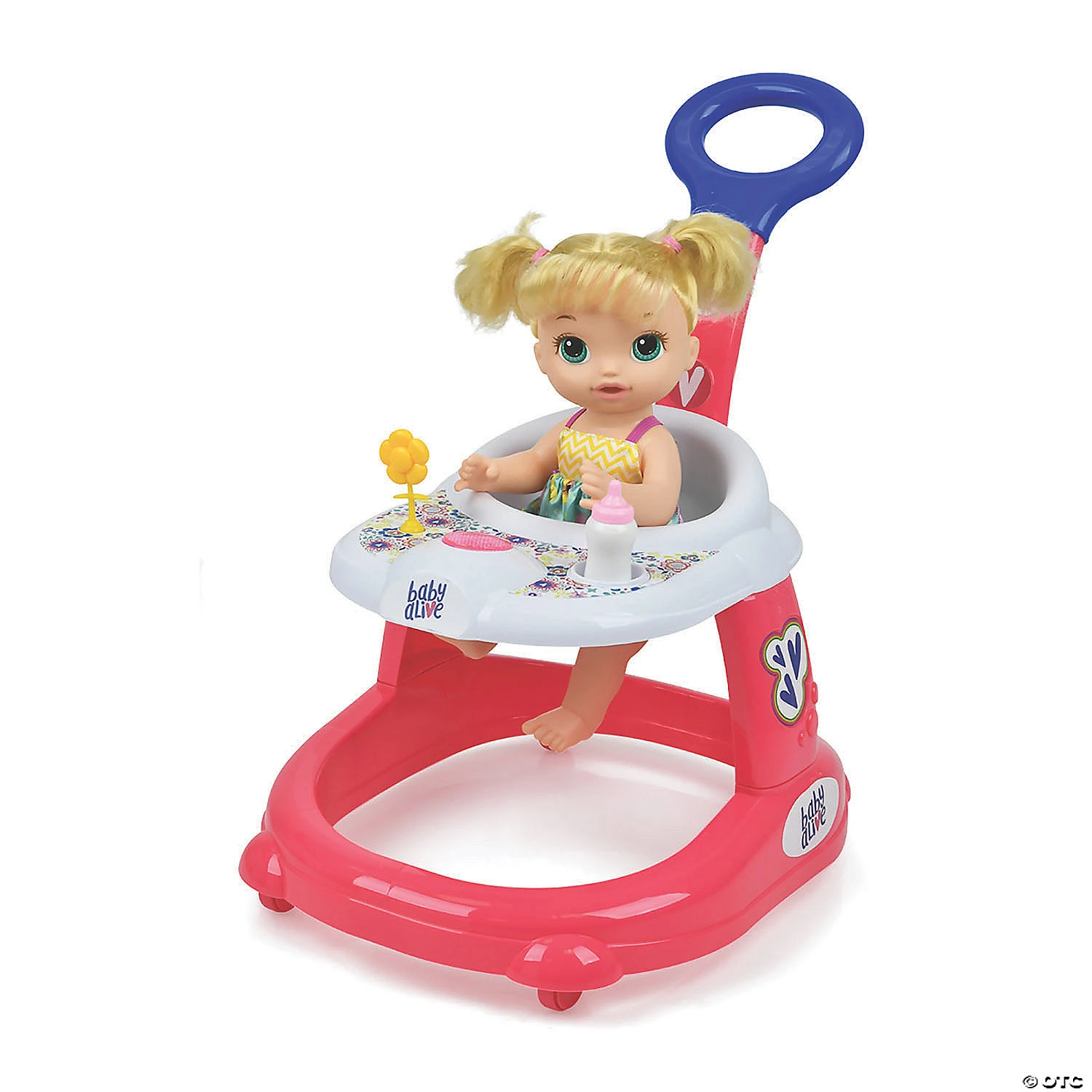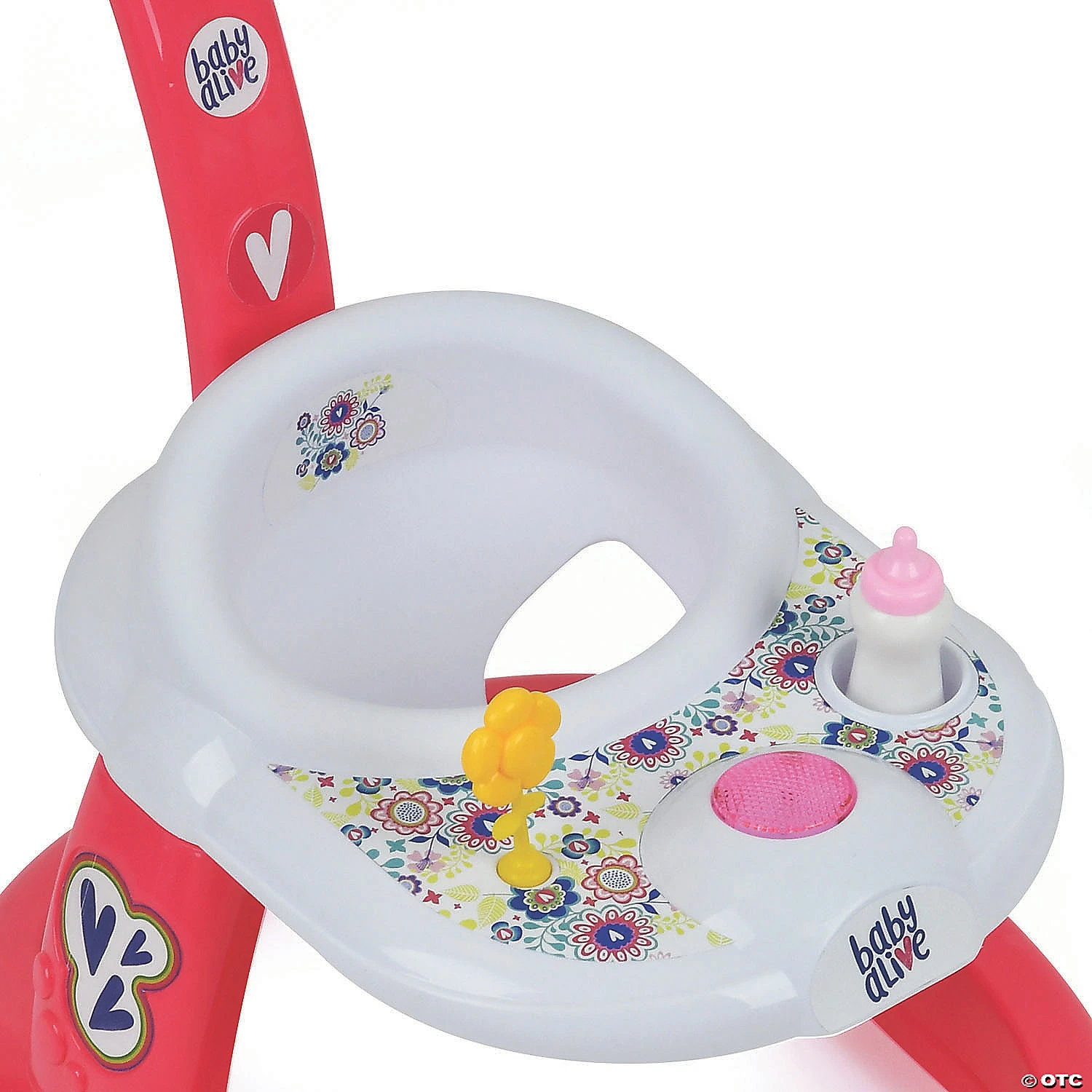 It’s the perfect addition to the Baby Alive Doll Accessories Collection. Super cute design; includes, fun floral accents, wheels, parent handle and feeding bottle. Walker features a interactive tray, lights and sound, bottle holder and a cute yellow flower! For dolls up to 18”. • Includes a parent handle, feeding bottle and wheels • Perfect accessory for all your dolls • Designed and fabricated from sturdy plastic• Interactive tray includes lights & sound, bottle holder and cute yellow flower• Batteries Required: 2 x AA (1.5 V)