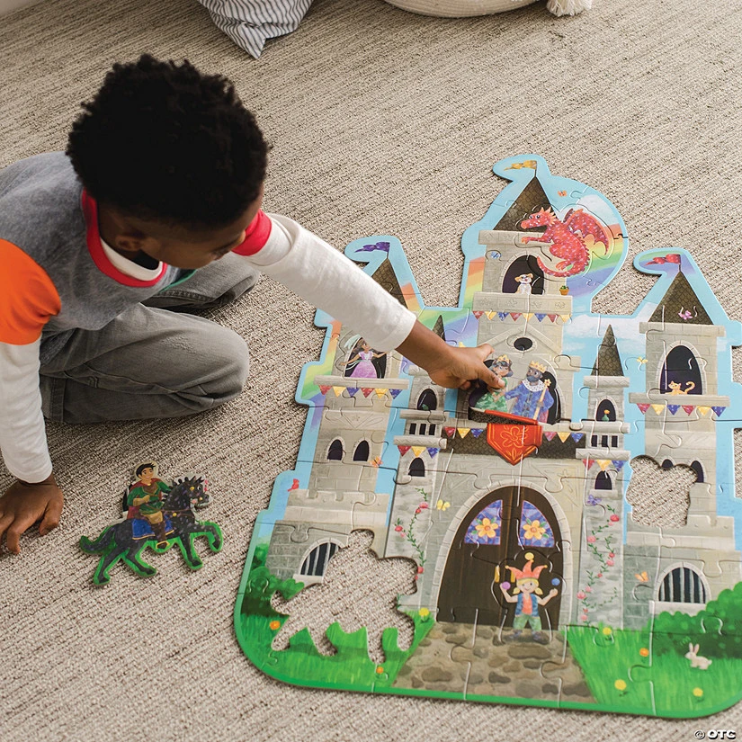 This shimmery castle entertainment can’t be beat! Featuring large puzzle pieces that are easy for small hands to fit into place, this puzzle also includes 5 special puzzle pieces shaped like a dragon, king and more to further enhance imaginative play. Young children will develop their fine-motor skills, visual recognition, problem solving and more as they find the right spot for each colorful, foil-accented puzzle piece. Designed for long-term use, this sturdy puzzle includes a convenient storage box with a cord for easy carrying. • Giant castle floor puzzle with shiny foil accents is sure to delight your preschooler• Develops visual recognition, cooperation, fine-motor development, problem solving and cognitive skills• Kids use their bodies and minds together to complete the puzzle• Perfect for home or classroom use• Includes foil-accented pieces that measure about 2’ x 3’ when assembled, plus a box with a carrying cord