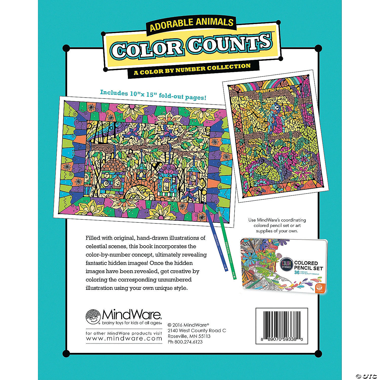 This new Color Counts coloring book incorporates a universal numbering system that pairs perfectly with our brilliantly-hued, 36-count Colored Pencil Set. Printed with coordinating numbers, the book and pencils are designed to make your coloring experience even more relaxing and enjoyable. Original, hand-drawn illustrations of animal scenes will reveal fantastic hidden details as you color. Once you’ve completed the numbered designs, try the un-numbered version of the illustration to add your own unique style. Each design, printed on artist-quality paper, creates a frame-worthy finished product! Includes 22 perforated pages including 8 fold-out pages that extend to a 10″ x 15″ size.Download Sample Page