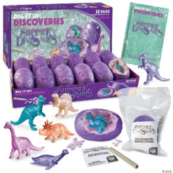 12 shimmering glittery dinosaurs hide within these 12 magical eggs, just waiting to be discovered! Once excavation is complete, learn about each unique dinosaur using the exploration guide. Did you know scientists do not know the true color of dinosaur skin? Could it have been shiny purple or sparkly pink? Who knows! Simply soak the clay eggs in water, then carefully chisel away the sedimentary material to reveal the shimmery dinosaur inside. • Each egg contains a different shimmery dinosaur toy• Helps promote an early interest in science and imagination for kids• The perfect activity for parties and groups • 12 eggs, chiseling tools and instructions