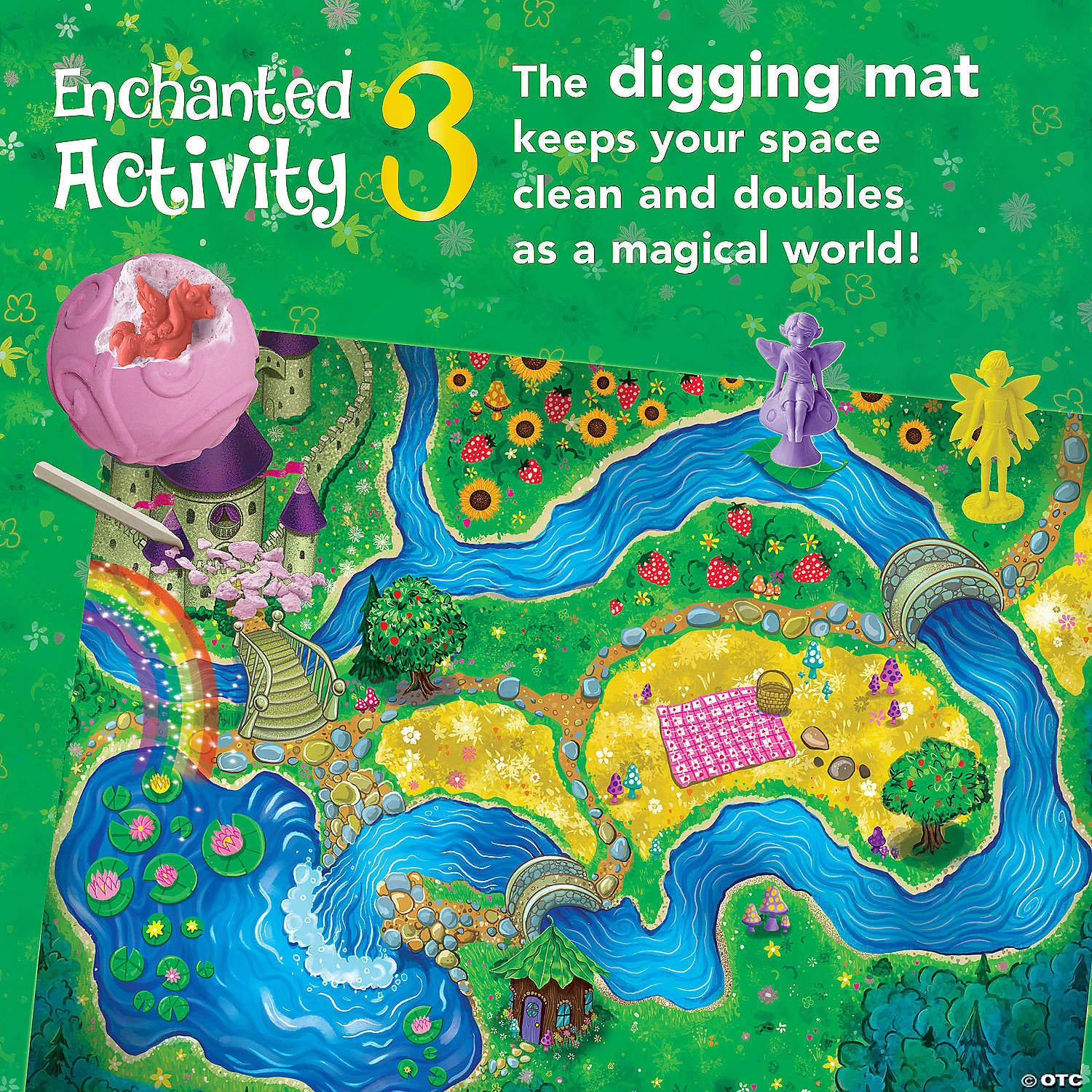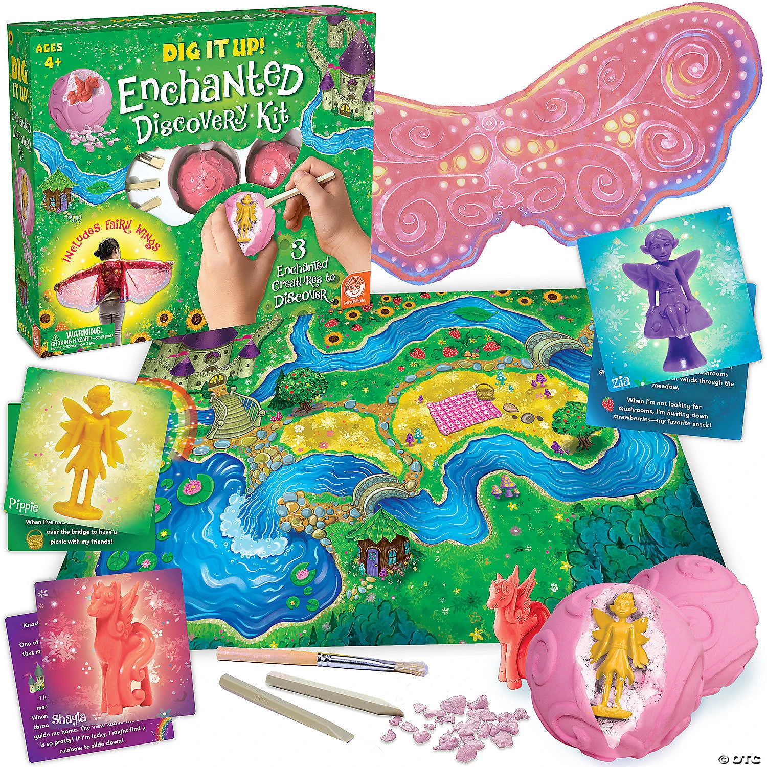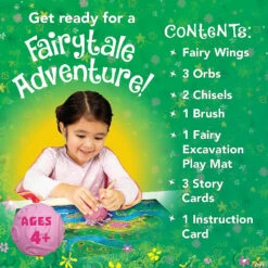 Put on the included fairy wings and flutter into a world of magical discovery! This spellbinding excavation kit features 3 fairy orbs, each with a unique fairy friend or other enchanted creature inside waiting to be set free. Simply soak the pods in water, then carefully chisel away the sedimentary material to reveal the fairies inside! Once excavation is complete, learn about each fairy’s special talents and fun facts about their habitats from the excavation guidebook. Then set your imagination free by using the excavation mat as a colorful background for your new fairy toys to frolic and play on. The digging mat keeps your exploration space clean and later doubles as a colorful play mat ready to unleash hours of imaginative play! • Includes fairy wings, 3 fairy orbs, 2 chisels, 1 brush, 1 excavation mat, 3 story cards, and instruction card• Encourages imaginative play and item classification