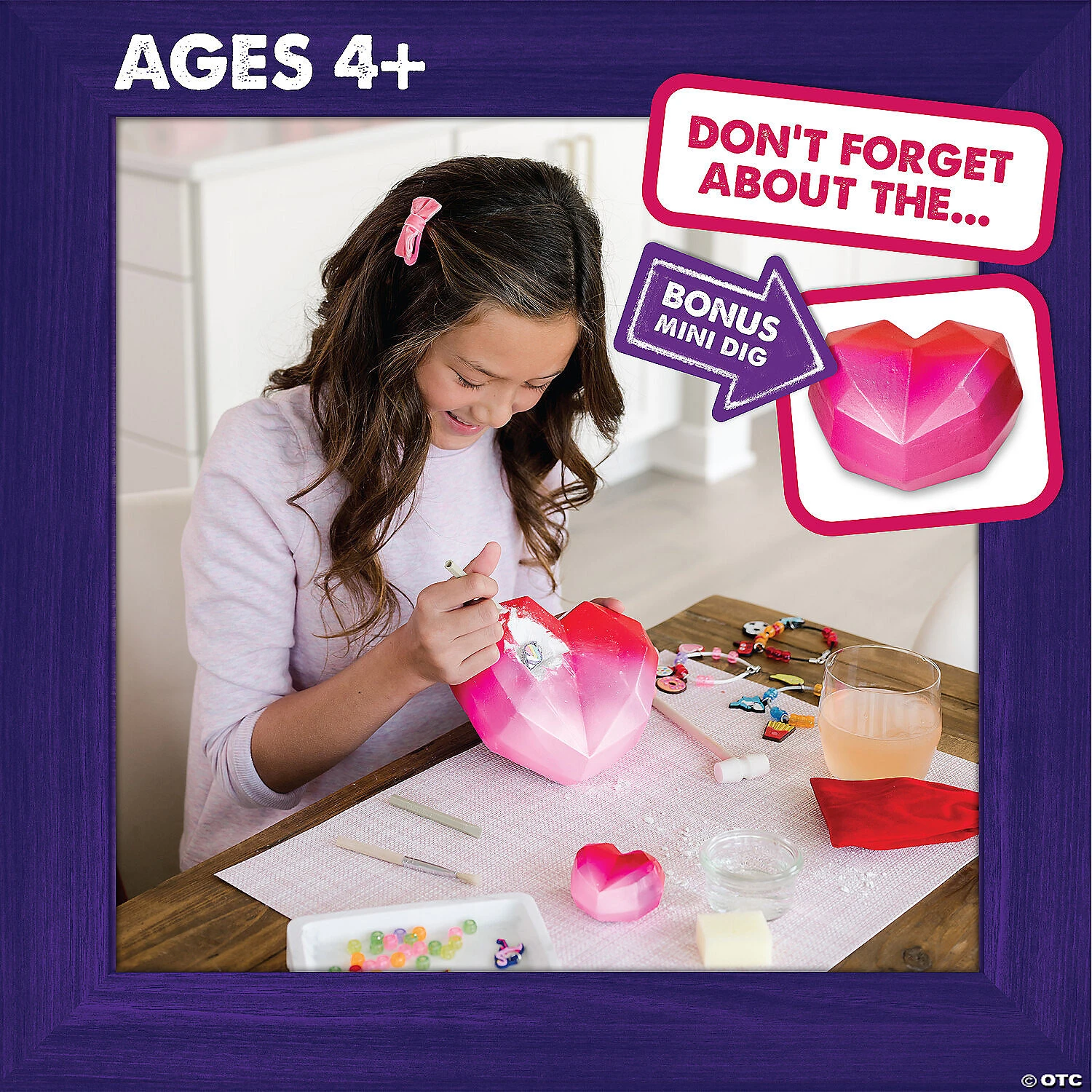 Inside this heart you’ll dig up cute charms, plastic beads and three bracelets: one for you and two for friends. Learn about the history of friendship bracelets, the benefits of having friends and even the significance of bracelet colors in the included guidebook. To get started, soak your dig project in a bowl or sink, chip away with your tools and discover what’s inside. This kit comes with a whole set of excavation tools for hammering, digging and brushing. Friendship bracelets have been beloved for many decades, and now it’s the next generation’s turn to get in on the fun!• Dig It Up! Giant Charm Bracelet Discovery contains 13 soft rubber charms to dig out and add to your friendship bracelets• Hands-on lesson in science that leads to fun with friends• 2 chisels allow you to dig with a friend or sibling• Includes giant heart filled with 12 charms, 2 chiseling tools, 1 hammer, 1 charm cleaning brush, 1 sponge, 3 bracelets, 75 beads, velvet storage bag, bonus heart dig with bonus charm and guidebookAge Recommendation: Ages 4 and up