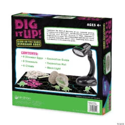 This exciting Dig It Up! experience includes two glow-in-the-dark elements: first, light up the eggs, then dig out the dinosaurs inside and place them under the included black light to enjoy their glow! Getting started is easy; just soak your dig project in a bowl or sink, chip away with your tools and discover. What kind of dinosaurs will you uncover as you dig?• Dig It Up! Glow-in-the-Dark Dinosaurs features 8 glow-in-the-dark eggs, each with a different glow-in-the-dark dinosaur inside!• Hands-on lesson in science and dinosaurs• 8 chisels allow you to dig with friends or siblings• Includes 8 glow-in-the-dark eggs, 8 different glow-in-the-dark dinosaurs, 8 chiseling tools, excavation guide, excavation mat, and black light• Black light requires three AA batteries (not included)Age Recommendation: Ages 4 and up