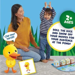 Get moving and grooving with this fun dancing game for toddlers! Duck Duck Dance! is simple and sweet, with 4 large dice featuring 8 different easy dance moves. From spinning to wiggling, players imitate the adorable ducks to uncover the 4 audience members to complete the game! All 2+ games include a parent guide with tips for adapting the game to your child’s age and skill level, as well as fun twists to play the game in new ways!• A fun and silly game that gets kids dancing, moving and grooving!• Kids learn gross-motor skills, counting, imitating, turn-taking and vocabulary building• Includes 1 pond game board, 4 movement dice, 4 pond audience members, instructions and parent guide