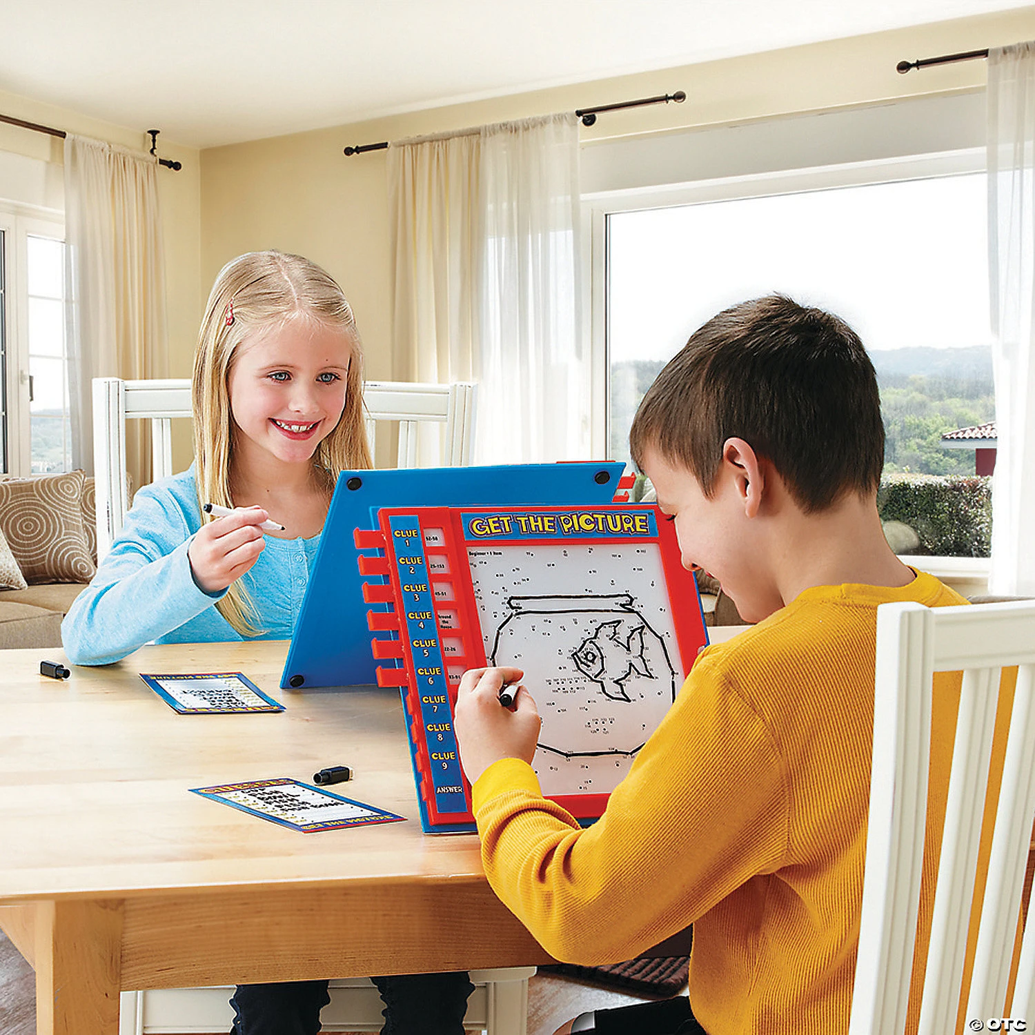 In this brain-bending spin on dot to dot puzzles, two players or teams race to identify their mystery images by following secret clues. The clue windows on the game board reveal a series of dots to connect, or a special puzzle-solving hint to decipher. Record your guess what the image might be after every clue. Continue opening windows, connecting dots and guessing until you get the picture – before your opponent does! You’ll need to avoid the decoy dots and think outside the box to win the game. Puzzle and guess cards can be wiped clean and reused again and again! Includes 2 picture frame boards, 60 puzzles, two “Guesses” cards and instructions. Download Instructions