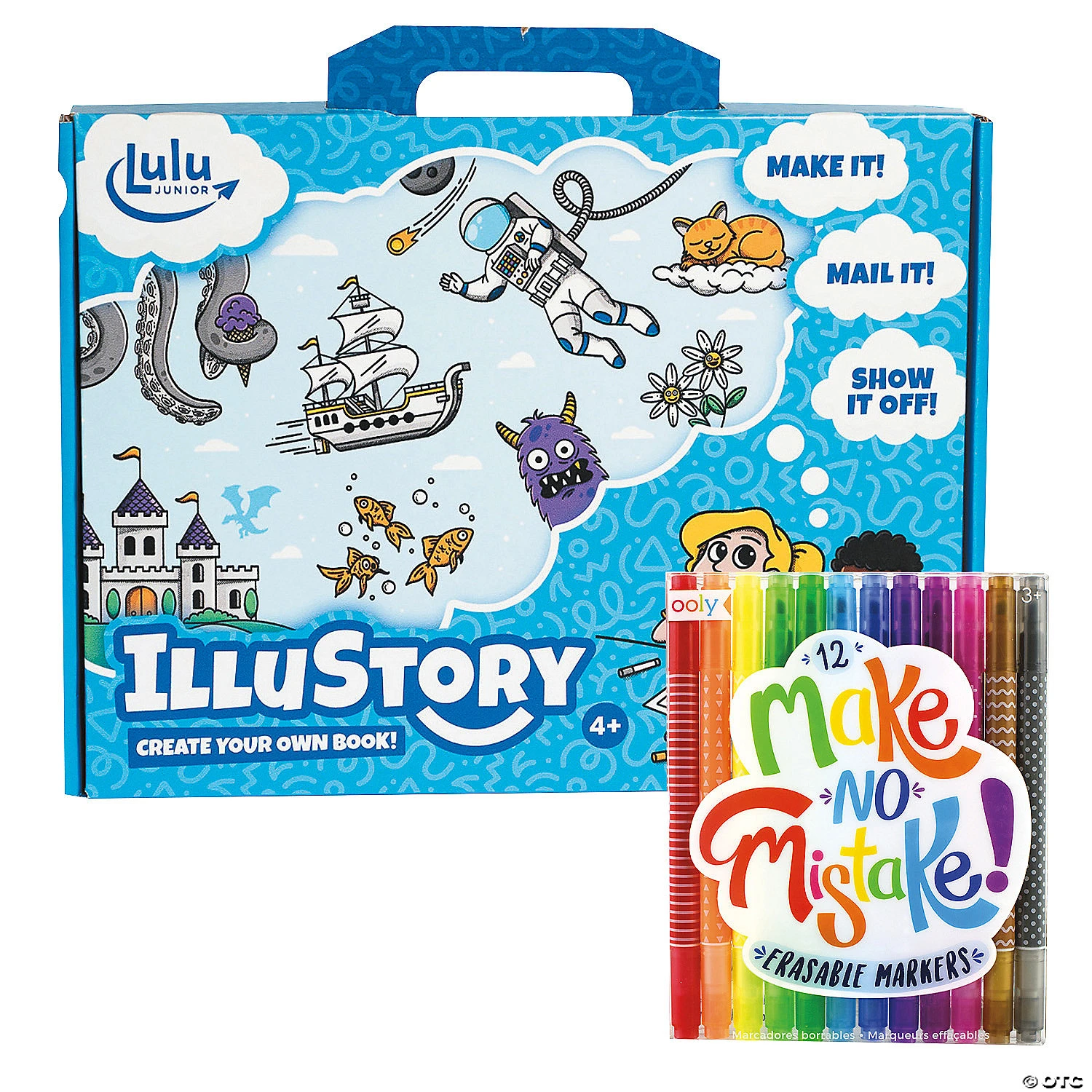 Kids will write and illustrate a story using this kit and the included Make No Mistake Markers, then receive a professionally printed, hardcover book version of their work. After writing and illustrating their book, use the postage-paid envelope to mail it in, then receive your book in a printed form. An easy-to-follow guidebook includes storytelling tips. Young writers will feel awed and empowered to hold a printed copy of their work in their hands! Learning to write is exciting and fun when the results are so gorgeous. Motivate your child to strengthen writing skills and celebrate his acomplisments forever with this kit. The “About the Author” feature even gives your child the chance to be showcased as the published author on the book’s back cover. Make No Mistake Markers let kids color and erase as much as they want. The marker and eraser combination allow kids to flip it over and use the eraser if they color outside the lines. Twelve bold and vibrant colors are included and let kids get started creating masterpieces. It’s the best of both worlds – the bright hue of a marker with the freedom of a pencil! • Illustory lets kids create their own book; Make No Mistake Markers let them color and erase.• Develops writing skills, creativity, self-expression• Illustory kid contains ready-to-use cover template pages, story and illustration template pages, guide book and instructions, a set of color markers and a postage-paid envelope and order form. Make No Mistake Markers include 12 vibrant colors