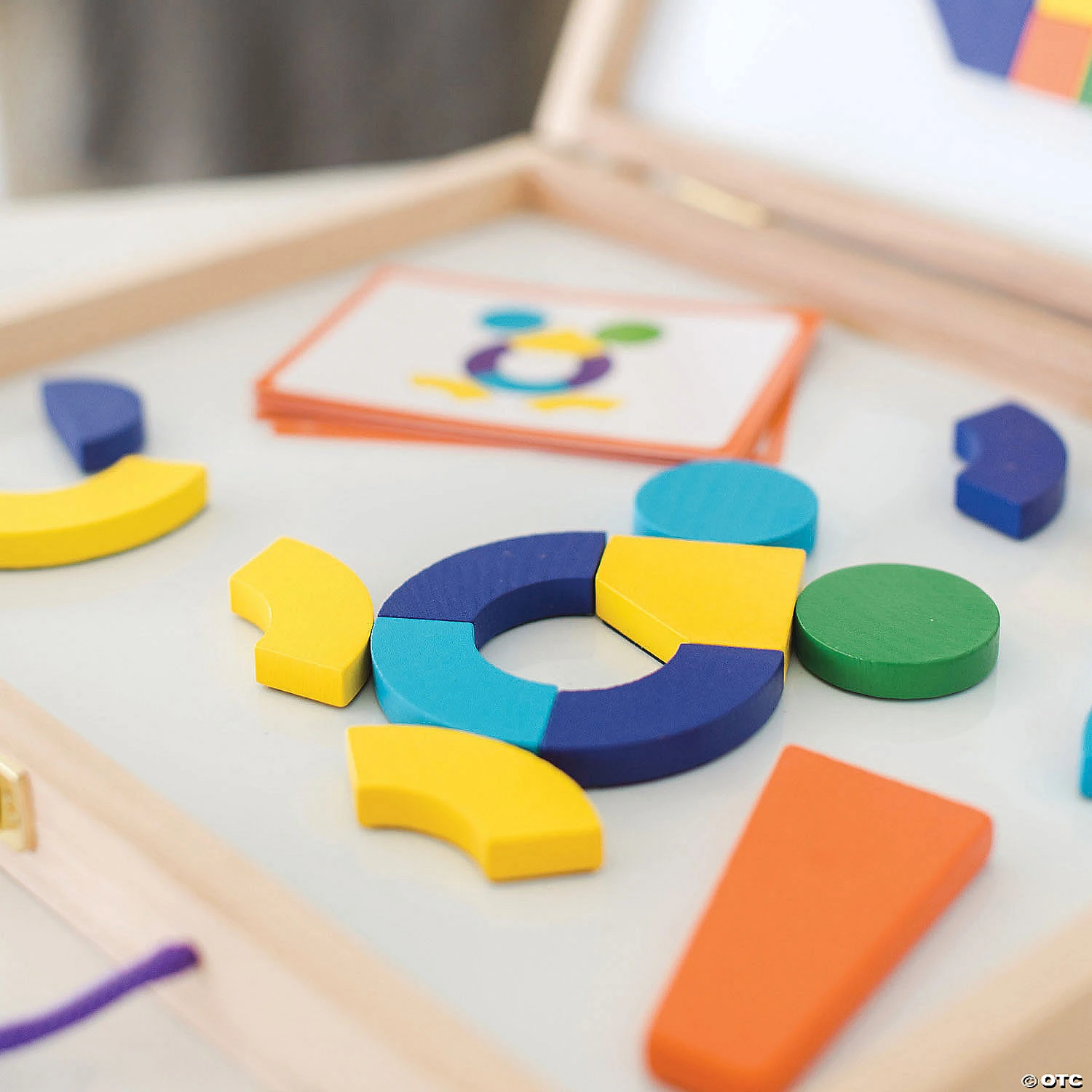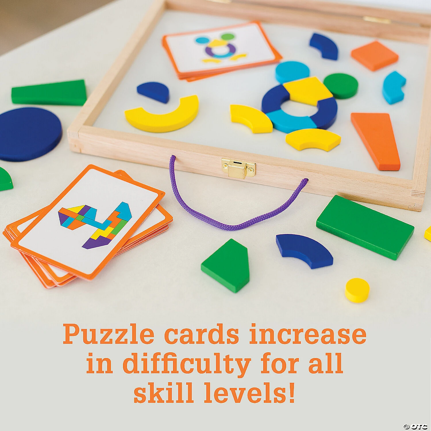 Boost your children’s fine motor and visual-thinking skills with geometric magnet play! This building toy features numbered pattern cards that increase in difficulty, ranging from beginner to expert. As patterns become more challenging, kids gain patience and confidence through trial and error. Or enjoy hours of imaginative free play! Includes 42 brightly-colored, solid wooden magnets for replicating any of the 50 full-color puzzles such as animals, faces, vehicles, flowers, structures and more. The magnetic surface doubles as a dry-erase board that can be decorated with your own dry-erase markers.• Colorful magnet shapes for uninhibited pattern fun• Pattern cards stretch the brain as kids duplicate the images, ranging from beginner to difficult• Magnetic surface doubles as dry erase board for doodle play