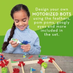 Calling all creative thinkers and curious minds—it’s time to tinker! The KEVA Maker Bot Maze lets you experiment, innovate and create with precision-engineered KEVA planks and a variety of doodads and gizmos! Customize a pair of motorized bots using crafty items found within this one-of-a-kind kit. The more unique looking, the better! Then construct your maze’s tunnels, doorways, passages and obstacles from the planks and connectors, or by gathering things you have around the house. KEVA Maker Bot Maze is the ultimate engineering tool—watch in awe as your personalized bot zooms through your hand-crafted maze! Creativity is the key to becoming a master maker. What will you create?• Strengthens understanding of design, strategizing and proportion • Creativity meets building • 30 KEVA Planks, 8 KEVA half planks, 25 connectors, 2 motorized bots, 6 tumble blocks and 3 bumper balls• Googly eyes, pipe cleaners, feathers, pom-poms, glue dots, tape, string, felt and craft foam
