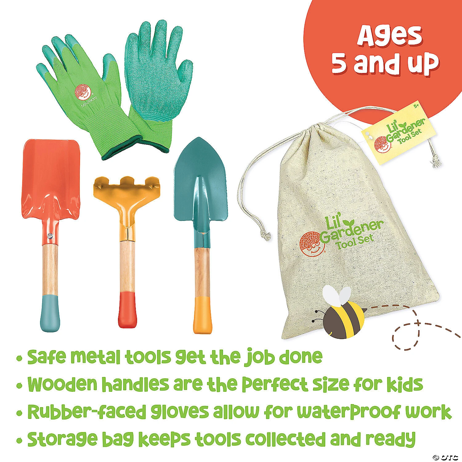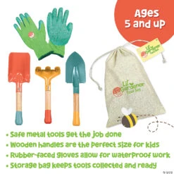 Teach kids yard care basics with their own gardening tools that are more than just toys…they’re durable tools with hardwood handles and high-quality metals! The kid-friendly sizes and bright, fun colors make them just right for young gardeners. They’ll love feeling just like Mom and Dad as they rake leaves, plant seeds and perform other outdoor tasks! Plus, they’ll be learning responsibility, patience and more to boot. When outdoor work is done, simply place the included hand trowel, scoop shovel, hand rake and rubber-coated gardening gloves in the convenient drawstring storage bag until the next gardening session. • Safe metal tools get the job done• High quality wooden handles are the perfect size for kids• Rubber-faced gloves allow for waterproof work• Storage bag keeps tools collected and ready