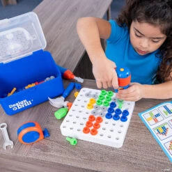 Drill, hammer, measure, and more with the Design & Drill Toolbox packed with real, working tools made safe just for kids. Little builders can power up pretend play and work on important fine motor skills with every tool. Store the included drilling boards, bolts, nails, and tools in the toolbox and take it anywhere fun goes for hours of construction creativity! Power drill and power screwdriver each require 2 AA batteries (not included).
