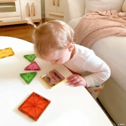 Build structures and create designs using these brightly colored magnetic tiles accented with mirrors and glitter. Magna-Tiles® can be used to create structures, but kids can also engage in open play with these colorful, shiny, glittery shapes. Make patterns, and designs on the floor, or use the magnets and create vertically on the fridge! This family-founded company has a heartfelt mission to help kids access simple, beautiful play as they discover more complex applications for the tiles. This is truly a toy that grows with your child, and provides hours of exploration and fun. • Magna-Tiles® Stardust set• Encourages free, creative play, develops math science, spatial and tactile skills• Includes 15 tiles; each shape has a base measurement of 3 inches