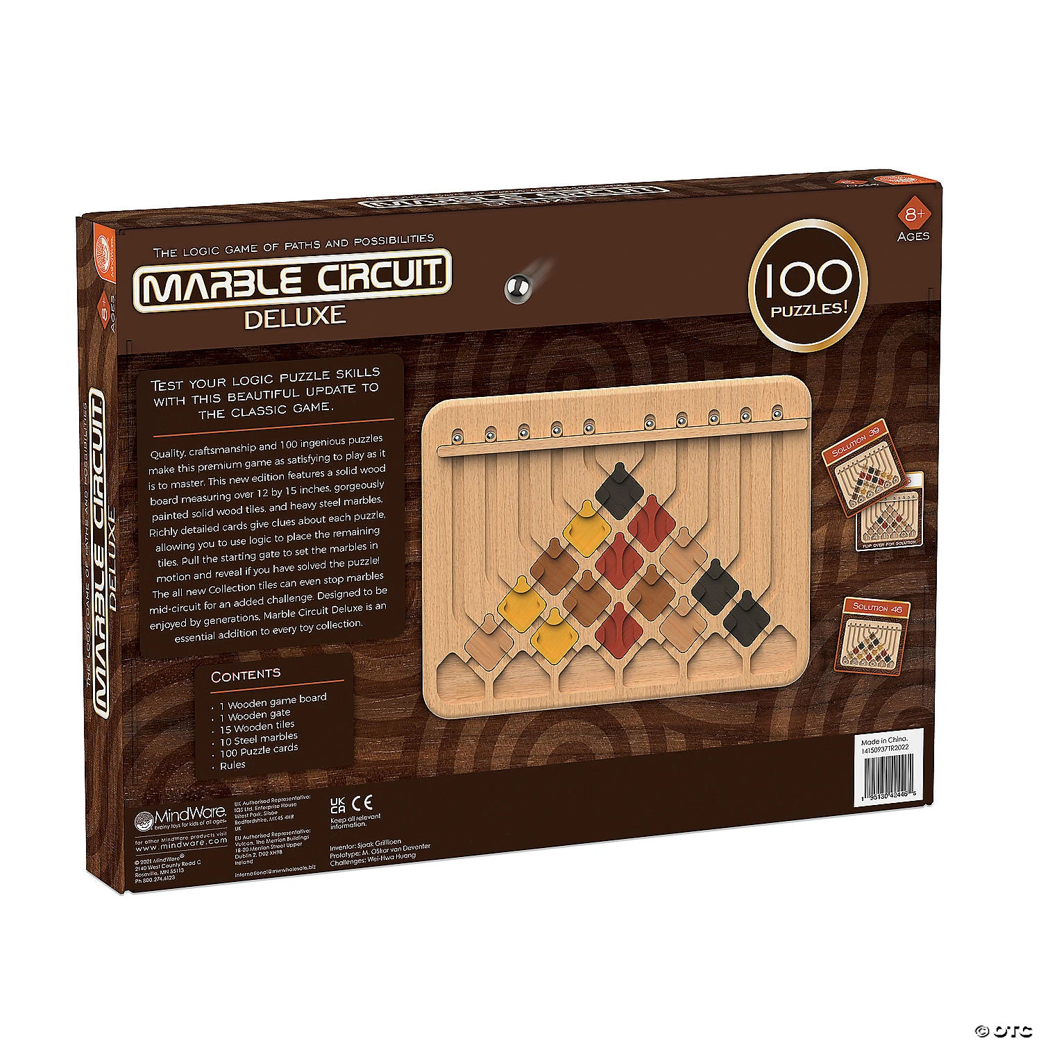 Quality, craftsmanship and 100 ingenious puzzles make this premium game as satisfying to play as it is to master. This new edition of the classic MindWare game features a solid wood board measuring over 12 by 15 inches, gorgeously painted solid wood tiles and heavy steel marbles. Richly detailed cards give clues about each puzzle, allowing you to use logic to place the remaining tiles. Pull the starting gate to set the marbles in motion and reveal if you have solved the puzzle! The all-new Collection tiles can even stop marbles mid-circuit for an added challenge. Designed to be enjoyed by generations, Marble Circuit Deluxe is an essential addition to every toy collection.• The logic game of paths and possibilities• Develops problem solving and cognitive skills, spatial recognition and an understanding of cause and effect• Includes 1 wooden game board, 1 wooden gate, 15 wooden tiles, 10 steel marbles, 100 puzzle cards and rules• Beautiful updated edition of the classic Marble Circuit MindWare game