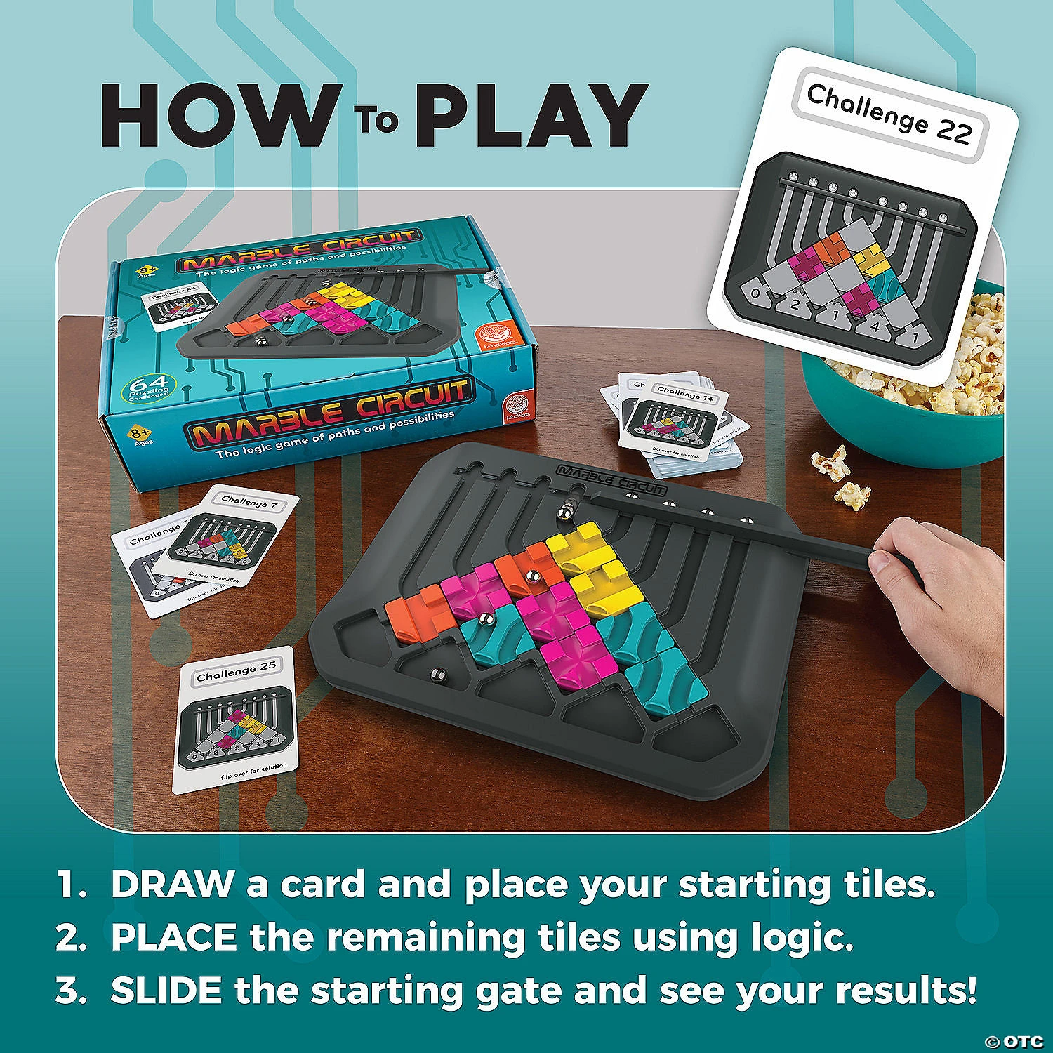 It’s the multi-directional marble maze with 64 puzzling challenges! Choose a card to see your puzzle and place the multi-directional tiles on the board. Release the steel marbles to see if you land your targets. If you’re off base, move the tiles until your marble circuits deliver a picture-perfect landing! It’s logic, strategy and a brain game all in one!• The addictive marble puzzle that puts a spin on traditional logic games for kids!• Develops problem solving and cognitive skills, spatial recognition and an understanding of cause and effect.• Includes gameboard, 64 puzzle cards, 10 multi-directional tiles, 8 steel marbles and instructions. Single player game.