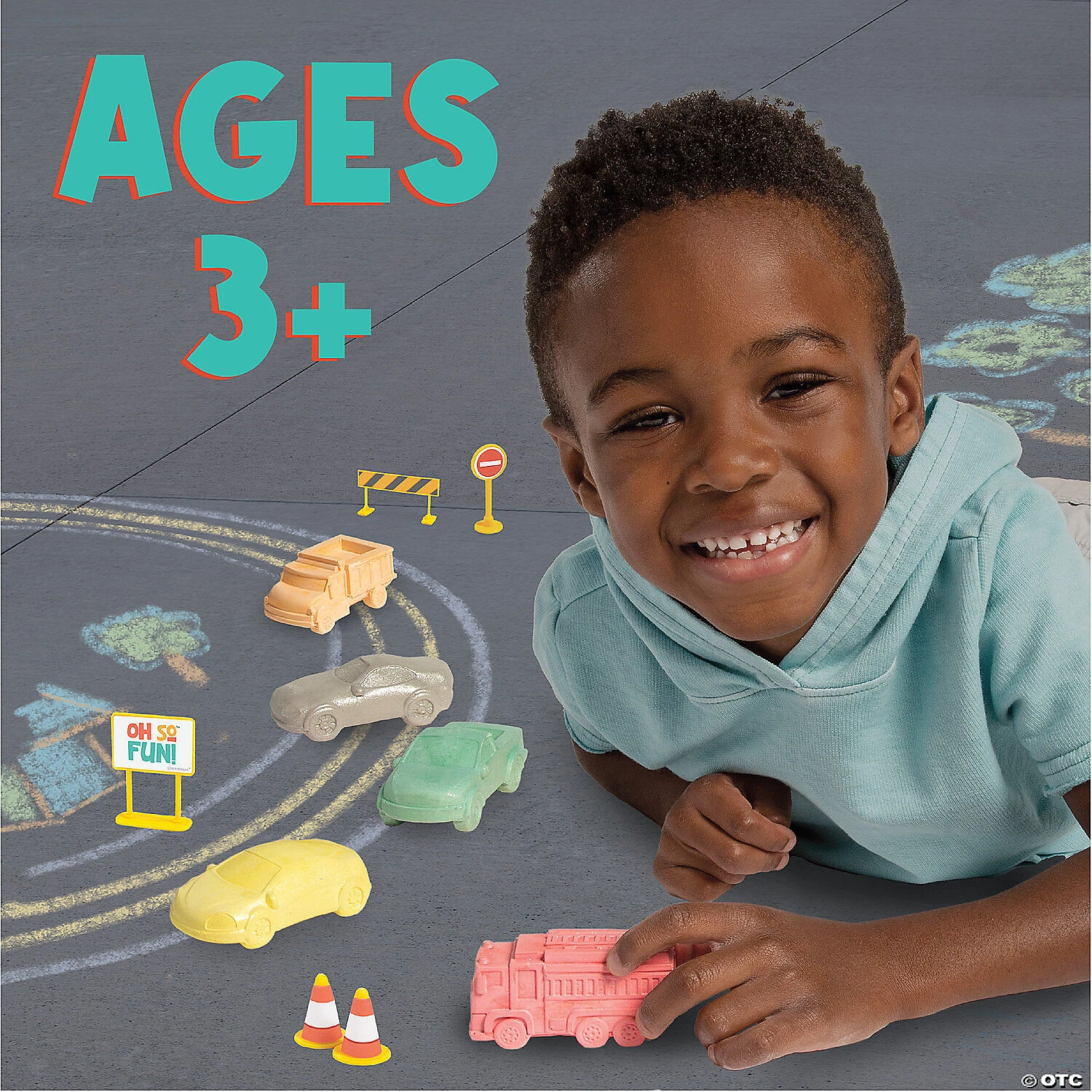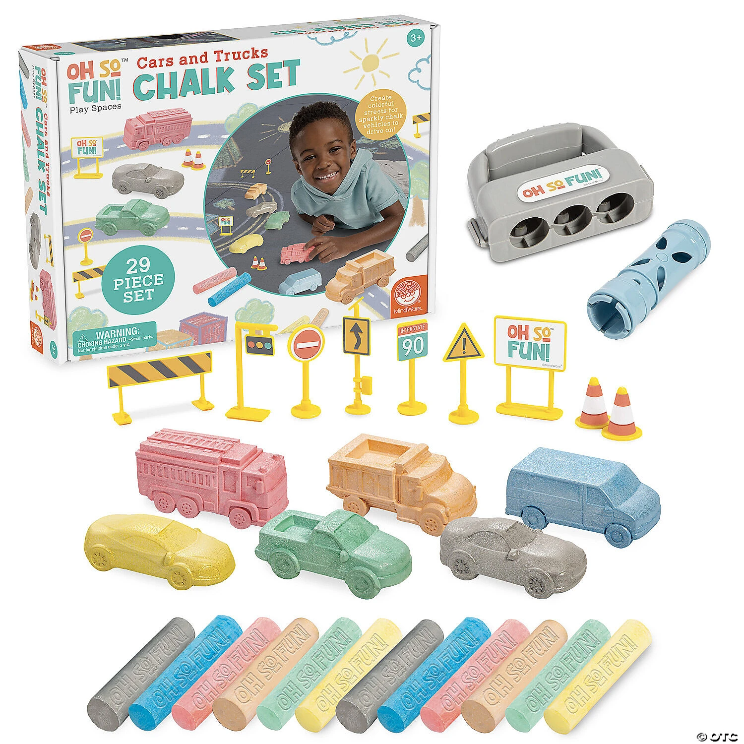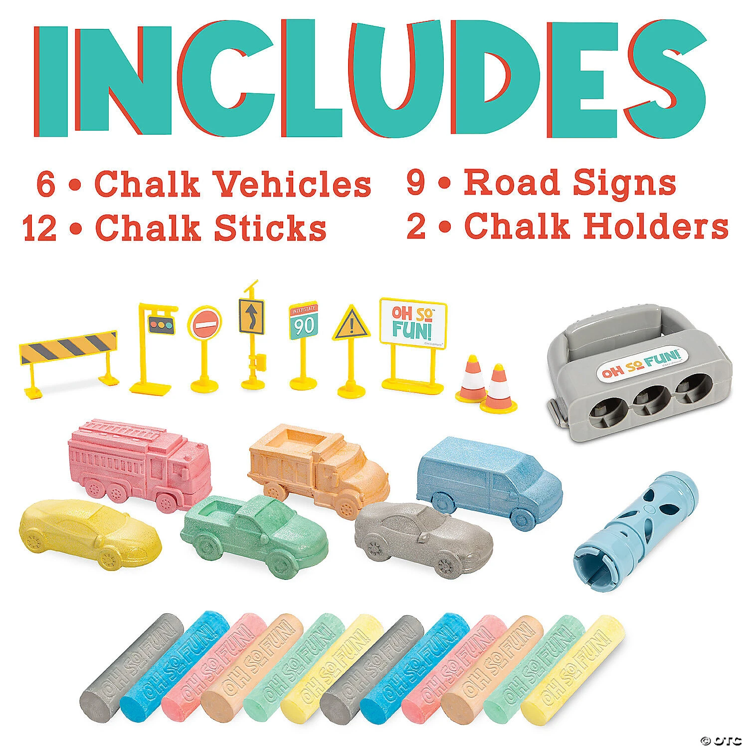Oh So Fun! Cars and Trucks Chalk Set has everything kids need to create their own make-believe towns as they embark on creative play. The chalk holder offers a mess-free way to draw roads, or they can use the chalk alone to draw buildings and landscaping for their towns. Realistic chalk vehicles and road signs add to the fun as they zoom their chalk vehicles through the communities they created. Chalk rising fun up to this unique outdoor play set! • Oh So Fun! Cars and Trucks Chalk Set helps children turn any outdoor surface into a thriving community complete with roads, buildings, cars and more• Develops self-expression, creativity and fine motor skills• Includes 6 chalk vehicles, 12 sidewalk chalk sticks, 9 road signs, 2 chalk holders & instructions with fun chalk-drawing tips