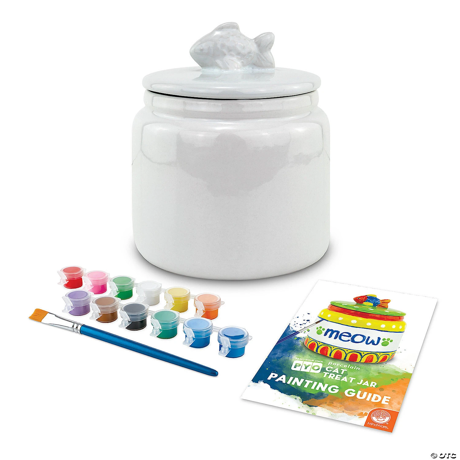 Budding artists can create their own designs on these treat jars, bake them for a long-lasting, high-quality look and then fill their creations with treats sure to send their beloved felines into a purring frenzy! With a silicone seal on the lid to help keep goodies fresh, this DIY home décor is both beautiful and functional. What a sweet way to delight your favorite four-legged friends while nurturing creativity! • Paint Your Own Porcelain Cat Treat Jar features a 5” x 6” jar that holds approximately 40 ounces of treats• Develops creativity, hand-eye coordination and color mixing skills• Airtight lid keeps treats fresh• Wipe clean with dry cloth • Includes porcelain cat treat jar, 2 paintbrushes, 12 paints and painting guide