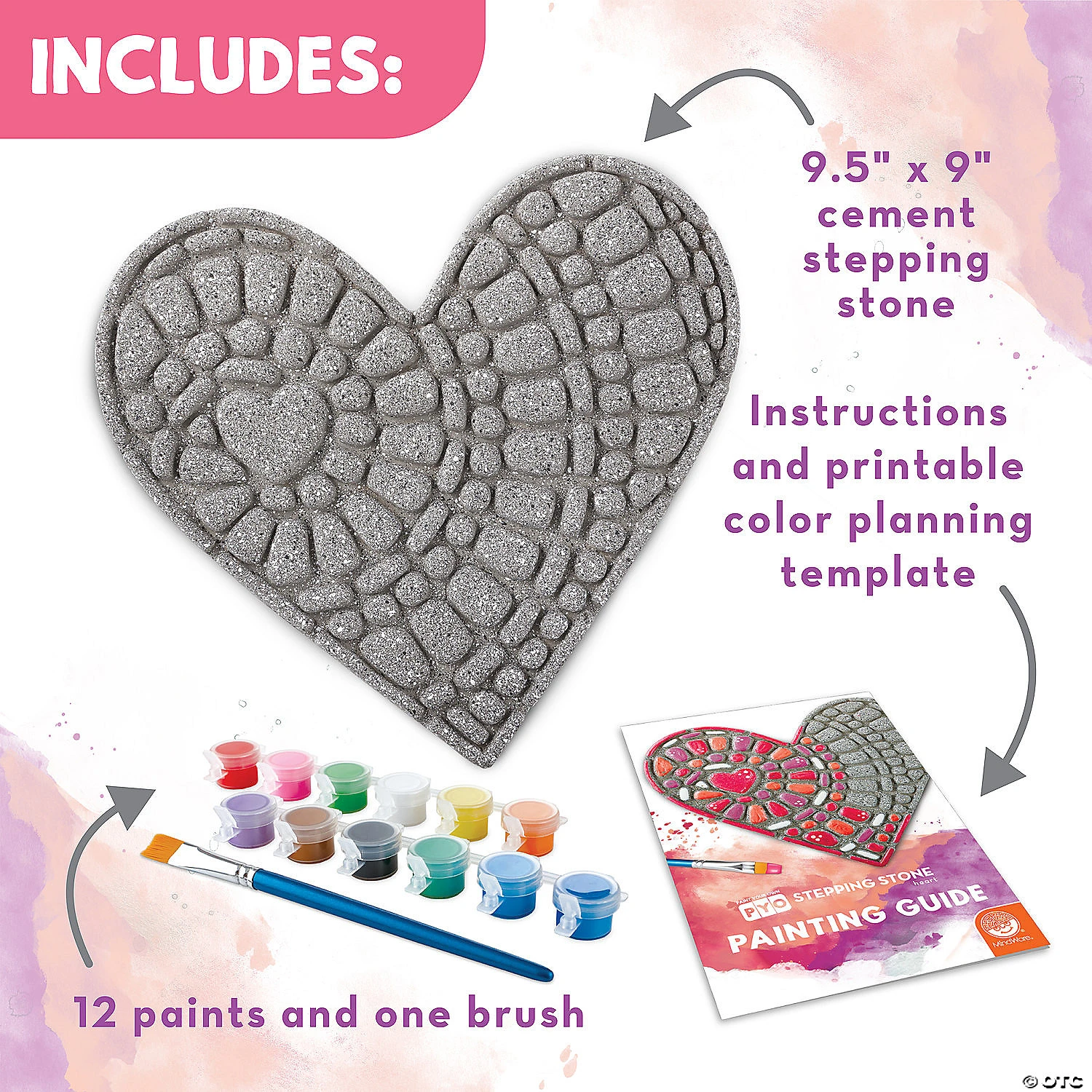 This all-weather stepping stone is ready to paint right out of the box, letting you skip messy cement-mixing and get right to the fun part: decorating and personalizing! A dozen vibrant paints allow for endless creativity—mix, blend and add custom color accents. Once painted, bake the stone in your oven for a long-lasting, weather-resistant finish. Display one stepping stone or make a whole pathway to transform your garden, backyard or patio! Kit includes a 9.5″ x 9″ cement stepping stone, 12 paints, a paint brush and instructions.• Decorate your outdoor living space• Develops creativity, hand-eye coordination and color mixing skills• Weather-resistant finish once baked• 9.5″ x 9″ cement stepping stone, 12 paints, a paint brush and instructions• Printable color planning template