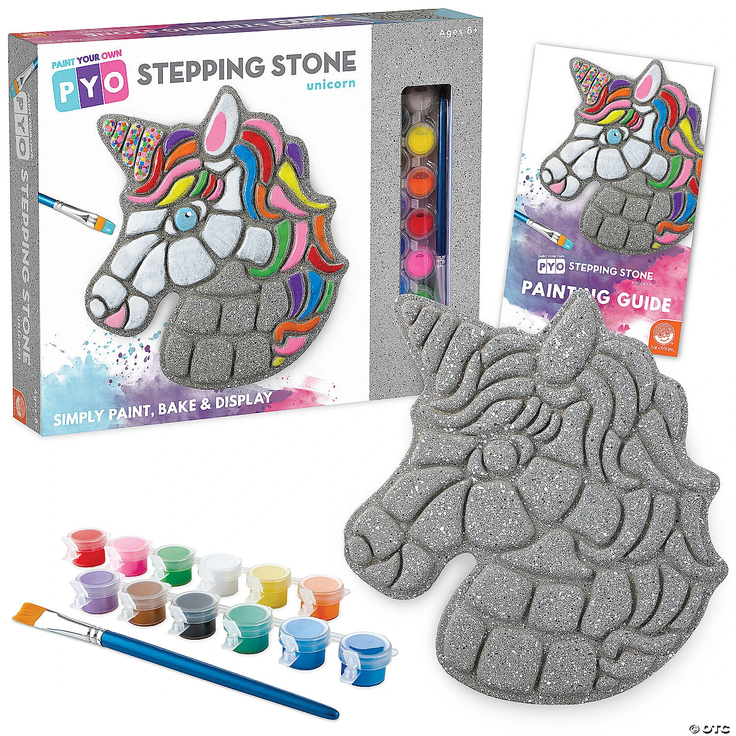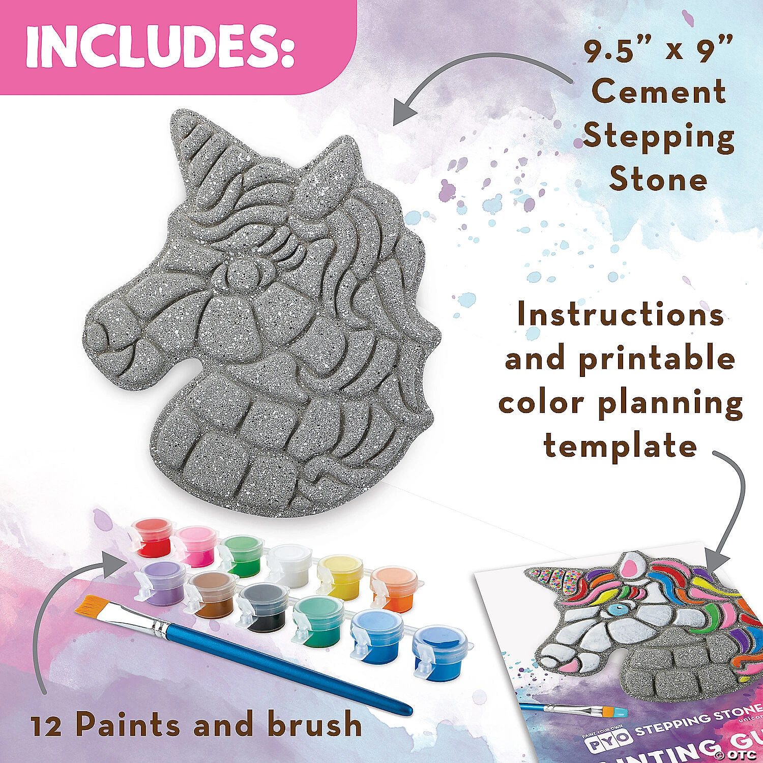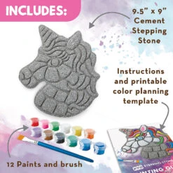 This all-weather stepping stone is ready to paint right out of the box, letting you skip messy cement-mixing and get right to the fun part: decorating and personalizing! A dozen vibrant paints allow for endless creativity—mix, blend and add custom color accents. Once painted, bake the stone in your oven for a long-lasting, weather-resistant finish. Display one stepping stone or make a whole pathway to transform your garden, backyard or patio! Kit includes a 9″ x 9.5″ cement stepping stone, 12 paints, a paint brush and instructions.• Decorate your outdoor living space• Develops creativity, hand-eye coordination and color mixing skills• Weather-resistant finish once baked• 9″ x 9.5″ cement stepping stone, 12 paints, a paint brush and instructions• Printable color planning template