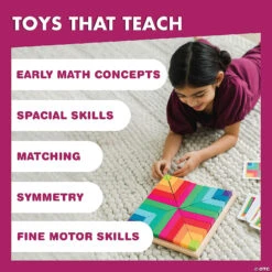 Problem solving becomes a rewarding work of art with Pattern Play: Color by Design! Use these brightly-colored blocks in varying shapes and the pattern cards to introduce significant math concepts like sorting, matching, symmetry, congruence and fractions. Pattern cards are numbered in order of difficulty, ranging from beginner to expert. With each dazzling build becoming more challenging, patience and confidence is gained through trial and error. The blocks can also be used to create endless freeform designs, providing hours of engaging creative play. Pattern Play is a quality learning tool that every household should own!• Develops early math concepts, spatial skills, strategy and fine motor skills• 40 glossy pattern cards and 40 durable wooden blocks guaranteed to last• Sturdy wooden tray is great for storage & travel• Even clean-up is learning opportunity • Other Pattern Play products include: Pattern Play 3D and Pattern Play Revolution