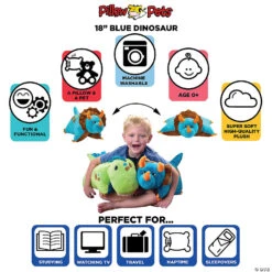 Pillow Pets brings you the plushiest and friendliest stuffed dinosaur you can find! Blue Dinosaur Pillow Pet features bright and vibrant blue chenille with brown and orange accents. Kids of all ages will enjoy the fun of everyday use as a toy for imaginative play and a large stuffed toy for reading, watching television, or studying with friends. Ideal for rest time and fun time – not to mention a comforting partner on road trips or airplane rides. Starts out as a pal, then unfastens and quickly becomes a comfy pillow!EASY TO CLEAN: To prevent damage and maintain plush just place your Pillow Pet inside a white pillow case and tie off the open ends. Wash with cold water on gentle cycle. Do not put in the dryer.SPECIFICS: Official Pillow Pets product. Dinosaur stuffed animal and pillow made of high-quality plush fabrics and BPA-free materials. Opens to an 18-inch flat stuffed toy. All sizes are approximate. Ages 0+. Special Shipping Information: This item ships separately from other items in your order. This item cannot ship to a P.O. Box. This item may be subject to additional processing days. ITEM IS NOT ELIGIBLE FOR EXPEDITED SHIPPING You may initiate a return for unused items within 30 days, if the items are in original packaging with all original materials included with the shipment.