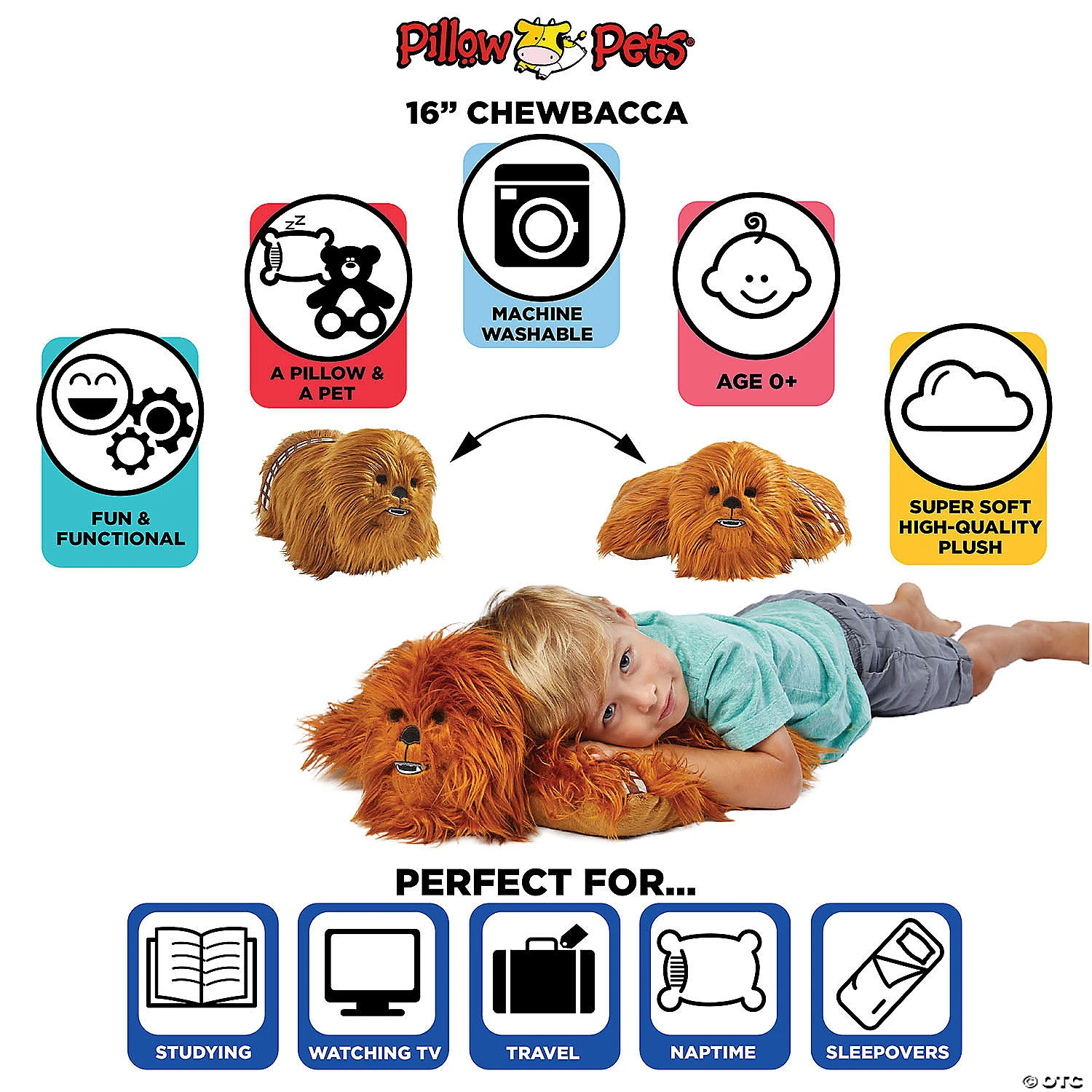 Pillow Pets and Disney Star Wars teamed up to bring Chewbacca out of the screen and into your home in a soft, cozy plush form that everyone can snuggle up with and enjoy. As an ace smuggler and rebel hero, Chewie is a favorite character among Star Wars fans. With this cute plush, pretend to fly on the Millennium Falcon with Han Solo by your side, saving the galaxy and narrowly escaping trouble! This Pillow Pet starts out as a fun pal to play with, and then unfastens to magically turn into a pillowCHEWIE: Your favorite Wookiee warrior is now a Pillow Pet! Co-pilot of the Millennium Falcon and Han Solo’s loyal friend, Chewbacca is a favorite character among Star Wars fans.COMFORTING COMPANION: Pillow Pets presents super soft, cute, & adorable stuffed animals that unfold into fuzzy pillows for sleep. Kids, teens, & adults love these classic & collectible comfy critters.COMFORT: This plush is a pal during the day, then unfastens to become a pillow at night! Comfortable travel friend for any child on road trips & airplanes. Also use as boy & girl bedroom decoration.BEST BUDDY: Children of all ages will love this original toy for play & as a large pillow for reading, watching television, studying, and sleepy nap time. Youth love to read with this cozy creature.SPECS: Official Pillow Pets & licensed Disney item. High-quality plush fabrics. BPA & Phthalates free. Unfastens into a 16in pillow. To wash, put in white pillow case & tie open end. Cold water. Gentle cycle. Ages 0+. Special Shipping Information: This item ships separately from other items in your order. This item cannot ship to a P.O. Box. This item may be subject to additional processing days. ITEM IS NOT ELIGIBLE FOR EXPEDITED SHIPPING You may initiate a return for unused items within 30 days, if the items are in original packaging with all original materials included with the shipment.