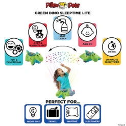 Pillow Pets brings you the plushiest and friendliest stuffed dinosaur you can find! Green Dinosaur Pillow Pet features bright and vibrant Green chenille with brown and blue accents. Kids of all ages will enjoy the fun of everyday use as a toy for imaginative play and a large stuffed toy for reading, watching television, or studying with friends. Ideal for rest time and fun time – not to mention a comforting partner on road trips or airplane rides. Starts out as a pal, then unfastens and quickly becomes a comfy pillow!EASY TO CLEAN: To prevent damage and maintain plush just place your Pillow Pet inside a white pillow case and tie off the open ends. Wash with cold water on gentle cycle. Do not put in the dryer.SPECIFICS: Official Pillow Pets product. Dinosaur stuffed animal and pillow made of high-quality plush fabrics and BPA-free materials. Opens to an 18-inch flat stuffed toy. All sizes are approximate. Ages 0+.” Special Shipping Information: This item ships separately from other items in your order. This item cannot ship to a P.O. Box. This item may be subject to additional processing days. ITEM IS NOT ELIGIBLE FOR EXPEDITED SHIPPING You may initiate a return for unused items within 30 days, if the items are in original packaging with all original materials included with the shipment.