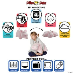 Get tons of warm snuggly happiness and cuddle up every day and night with the Pillow Pets Wiggly Pig! The plushest, friendliest, and softest stuffed animal you will find. Kids of all ages will enjoy the fun of everyday use as a toy for imaginative play and a large stuffed toy for reading, watching television, or studying with friends. Ideal for rest time and fun time – not to mention a comforting partner on road trips or airplane rides. Starts out as a pal, then quickly unfastens to become a comfy pillow!Wash on gentle cycle and cold water placing your Pillow Pet inside a white pillow case and tying off the open ends to prevent damage during washing and maintain plush. Do not put in the dryer.SPECIFICS: Official Pillow Pets product. Made of high-quality plush fabrics. Opens to an 18-inch flat stuffed toy. All sizes are approximate. Ages 0+. Special Shipping Information: This item ships separately from other items in your order. This item cannot ship to a P.O. Box. This item may be subject to additional processing days. ITEM IS NOT ELIGIBLE FOR EXPEDITED SHIPPING You may initiate a return for unused items within 30 days, if the items are in original packaging with all original materials included with the shipment.