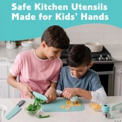 This kit has everything chefs-in-training need to get in on the fun charcuterie trend, including 3 kid-safe knives that slice through foods while sparing little fingers, 25 kid-sized utensils, full-color recipe cards and a pamphlet to give ideas for fun holiday-themed trays. Use the wooden charcuterie board, shaped cutters and more to create adorable, delicious charcuterie boards for any occasion. Young chefs will delight in trying these new and favorite foods they’ve prepared themselves with kid-tested recipes!25 Piece Deluxe Set Includes:• 10″ X 8″ Wooden charcuterie board and 10″ x 7″ Cutting board• 3 Safety knives in 4.75″, 5.75″, and 6.75″ lengths• 2 Heart cutters sized 2.5″ and 1.5″• 2 Star cutters sized 2.5″ and 1.5″• 2 Flower cutters sized 2.5″ and 1.5″• Serving tongs and non-slip tongs• Tablespoon measuring spoon• Dip bowl• 10 Star food picks• 3 Double-sided recipe cards• Holiday idea bookKid-Friendly Tools: Safety knives are optimized for functionality. The plastic blades are engineered to cut through hard foods like carrots and apples without any danger to hands or fingers. Fun shaped cutters help encourage kids to try new foods and are a quick and easy way to dress up your charcuterie boards.Oversized Recipe Cards: Kid-tested dips and fun charcuterie board recipes will keep your young chef engaged. The oversized recipe cards provide clear inspiration pictures, fun facts about food, useful information about kitchen tools and more! Holiday Ideas: The full color Holiday Supplement provides inspiration for six celebrations!