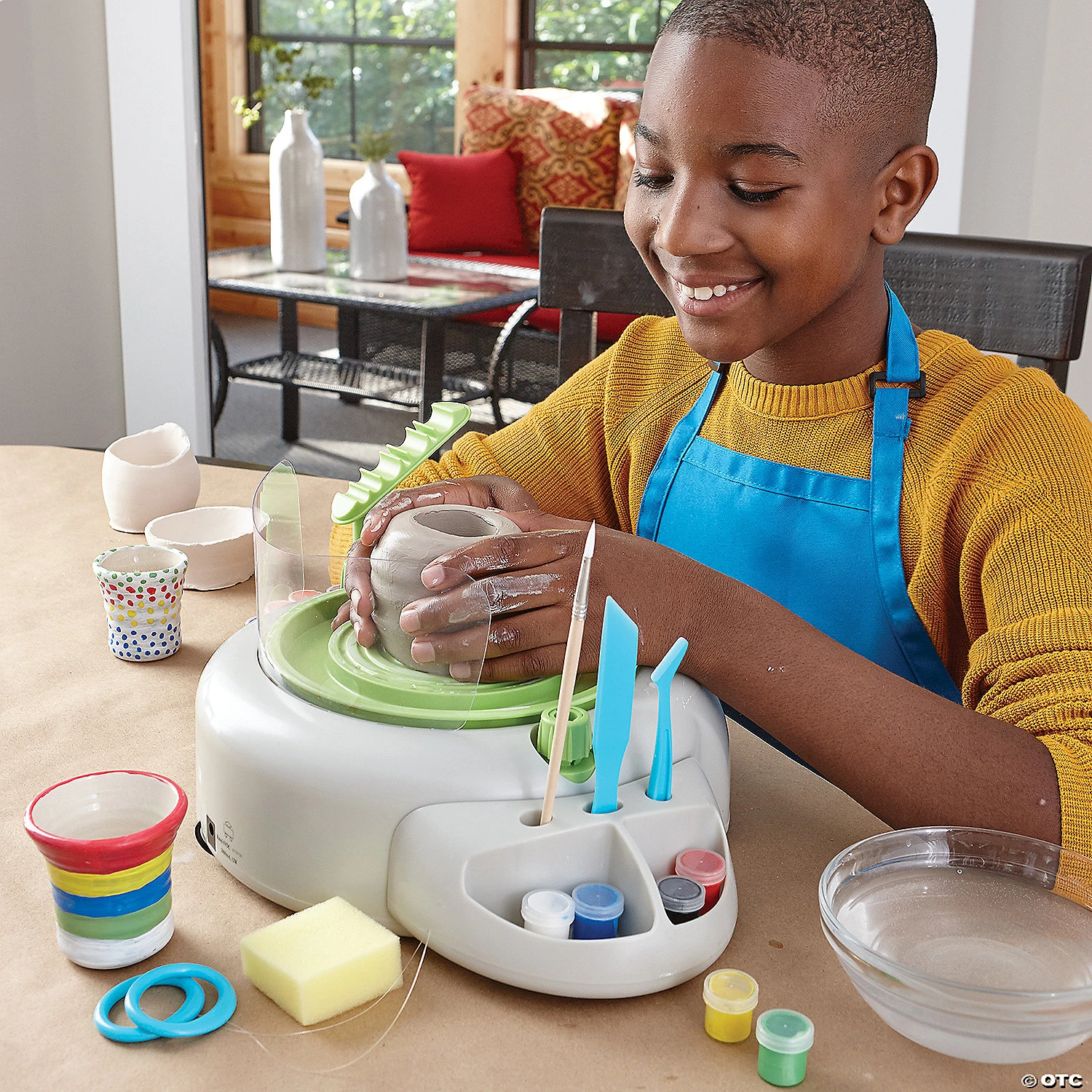 Young artists can make beautiful ceramics to give or keep with this foot pedal-operated, dual speed and dual direction pottery wheel. Our deluxe kit includes an AC adapter to power the wheel’s multi-speed motor, 2 1/2 pounds of pre-mixed air-dry clay, sculpting and cutting tools, 12 paints, paint brush, splatter shield and guide book. • The strongest and most durable toy pottery wheel available for children.• Foot-pedal driven; AC adapter is included.• Safety Stop Feature automatically stops the motor if too much pressure is applied, preventing the pottery wheel motor from overheating or burning out.• Features an upright tool support that can be placed on either the left or right-hand side of the pottery wheel base. The tool support allows you to smoothly and evenly engrave or paint your pottery creation while it spins on the wheel.• Accessories include: Clay cutting tool, engraving tool, modeling tool, sponge, 12 paints and a paintbrush.