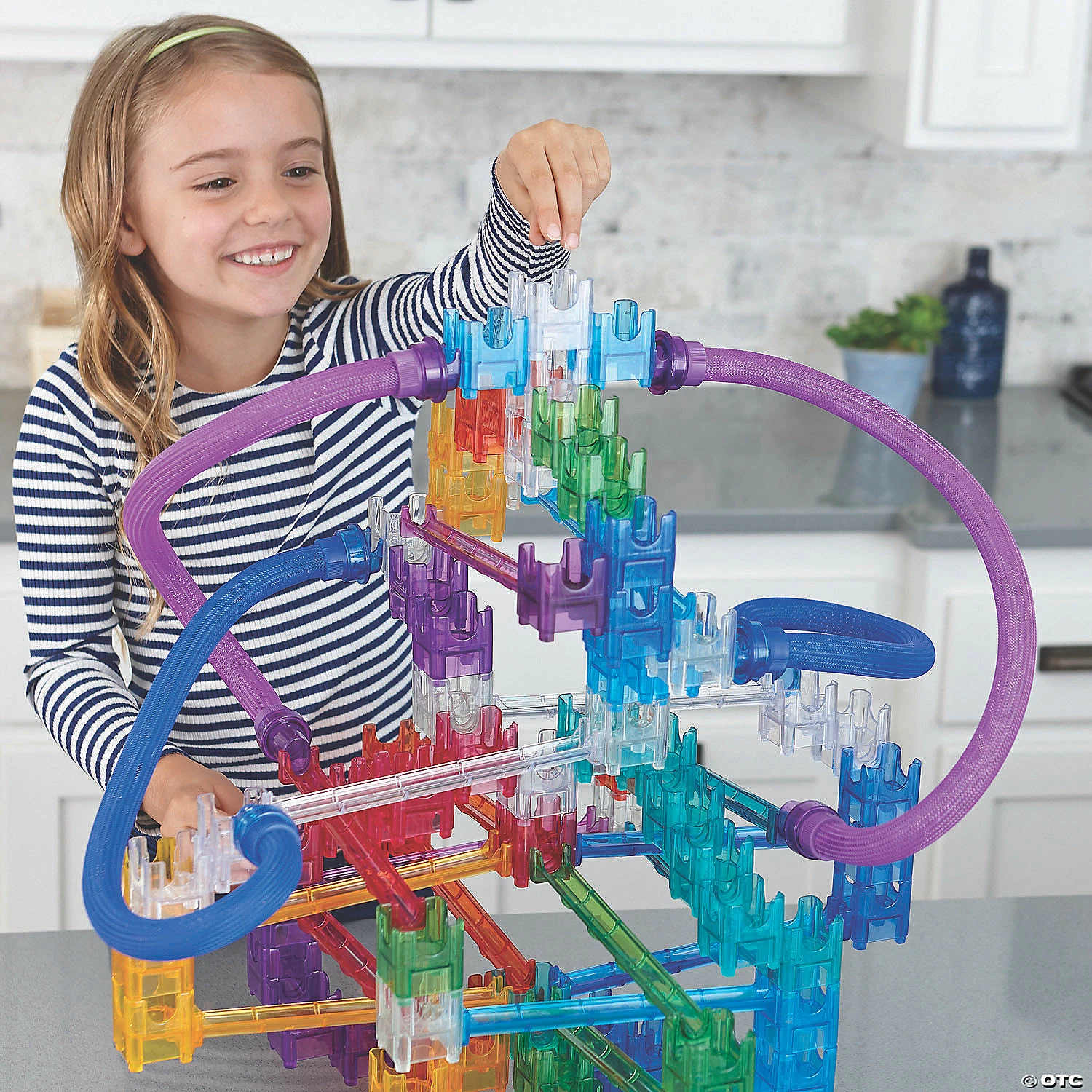 Q-BA-MAZE is a unique system of colorful cubes that interlock to form an exciting marble run. The big difference? The configurations are UNLIMITED: create runs shaped like rockets, robots, butterflies, or whatever design you want!This kit includes:Q-BA-MAZE Rails Extreme, complete with 18 straight-away rails that connect easily to any cube or to each other to create tracks that send your marbles zigzagging through the maze of colorful cubes. With another 82 cubes, 4 coaster tubes, 4 marble catchers and 30 steel marbles, the possibilities are endless!FREE Light-Up Cube Pack of 4 clear light-up cubes works with any Q-BA-MAZE 2.0 set to add a spark of excitment to your build. Each cube lights up as the marbles pass through, flashing red, green, blue or white.• Revolutionary cubes create endless paths and artistic build possibilities• Encourages imaginative thinking, STEAM skills and cooperative play• Follow the step-by-step directions or experiment with your own original creations• Well-crafted and durable pieces are made from phthalate-free and BPA-free ABS plastic• Double exit cubes allow for several different pathways!• Marbles are nickel plated steel balls. They are not magnetsWatch The Building Basics