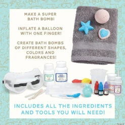 Discover the relaxing side of science with the Science Academy: Bath Bomb Lab kit. By just using a little understanding of chemistry, kids will be able to make cool bath bombs for an aromatic and fizzy bath. This kit offers multiple recipe options to experiment with, giving you options for different sizes, colors and scents, and even the ability to create a super bath bomb for ultimate fizzy fun. This kit makes learning about unique chemical reactions occurring within the creation and use bath bombs easy, safe and exciting. If you’re looking for an educational lesson in chemistry that also creates a lush after-product, this bath bomb lab is exactly what you want to soak up. Comes with: sodium bicarbonate, citric acid, cornstarch, glycerin, two measuring beakers, bath bomb molds, two pairs of latex free laboratory gloves, goggles, spoon, two bottles of liquid coloring, vanilla fragrance, three stirring sticks, bamboo stick, two balloons, balloon ties and pipette.• Learn about the unique chemistry needed to create a bath bomb• Experiment with different sizes, shapes, colors and scents• Fun, safe and non-toxic hands-on lab• Teaches: a love for chemistry, an interest in general sciences, critical thinking skillsDownload Guidebook