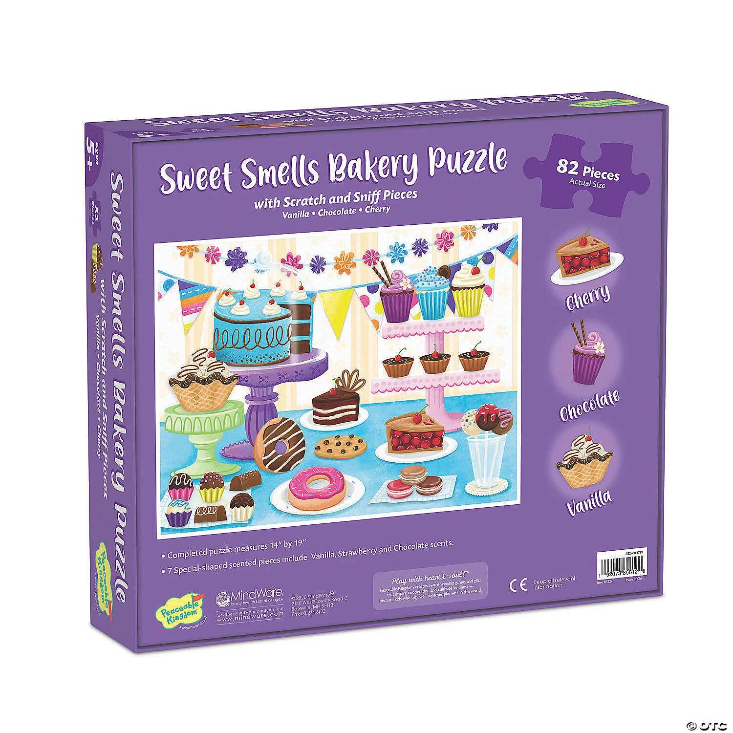 Experience multi-sensory fun with scratch and sniff puzzles! Engaging to solve, the fun final scene is a delight when the puzzle is complete. Create a beautiful bakery window scene complete with frosted donuts and cake pops, with pieces in vanilla, chocolate and strawberry scents.• Put together a scratch and sniff scene with colorful pieces and sweet scents• Kids learn visual and scent recognition, fine-motor development, problem solving and critical thinking• 82 piece puzzle measures 14″ x 19″ when complete!• Enjoy other scratch-and-sniff puzzles: Jelly Jammers Rock Monsters or Fruity Pool Party• 7 Special-shaped scented pieces that include Vanilla, Strawberry, and Chocolate scents