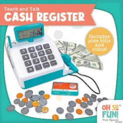 Our Oh So Fun! Cash Register comes loaded with features that encourage imaginative play all while making real-world money and math skills add up—cha-ching! Talking and sound functions add to the fun and realism. Real working scanner, keypad and card swipe features bring the concept of play to real world encounters. The register includes realistic play money, coins and a credit card – giving children the opportunity to become familiar with the size, value and function of these components. The cash register’s unique two-sided design fosters cooperative play as children interact with each other as the customer and cashier. Talking and sound functions engage and instruct the child as they play.• Includes two-sided register, scanner, credit card, 30 pretend bills, 40 pretend coins and guide• Requires 3 AA batteries (not included)